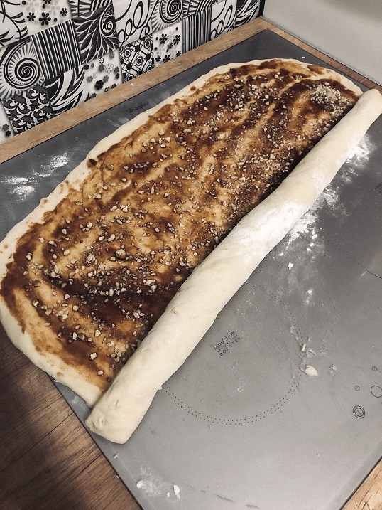 Kiedy ciasto wyrośnie, lekko je zagniatam i rozwałkowuję nadając mu kształt prostokąta. Robię to na szklanej płycie indukcyjnej, podsypuję mąką. Sprawdzony sposób na nie przywieranie ciasta. Na ciasto wylewam nadzienie, rozsmarowuję i posypuję orzechami. Zwijam wzdłuż dłuższego boku. Nagrzewam piekarnik do 180°C,termoobieg góra-dół.
