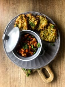 Gulasz wołowo-wieprzowy w pomidorach z pieczonymi plackami ziemniaczanymi