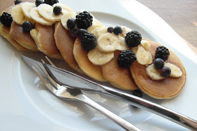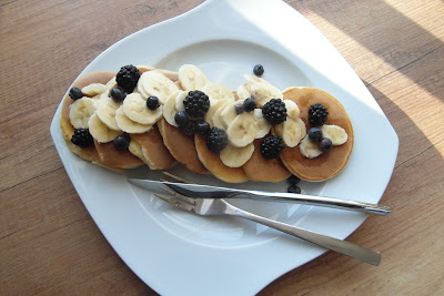 Najczęściej placuszki wcinamy z bananami i z nimi smakują najlepiej. Dziś na naszych talerzach wylądowały z bananami, a oprócz nich zagościły jeżyny i borówki amerykańskie. Dary od Cioci Steni i Wujka Janka. Pycha!!! Prosto z krzaków, bardziej BIO się nie da.