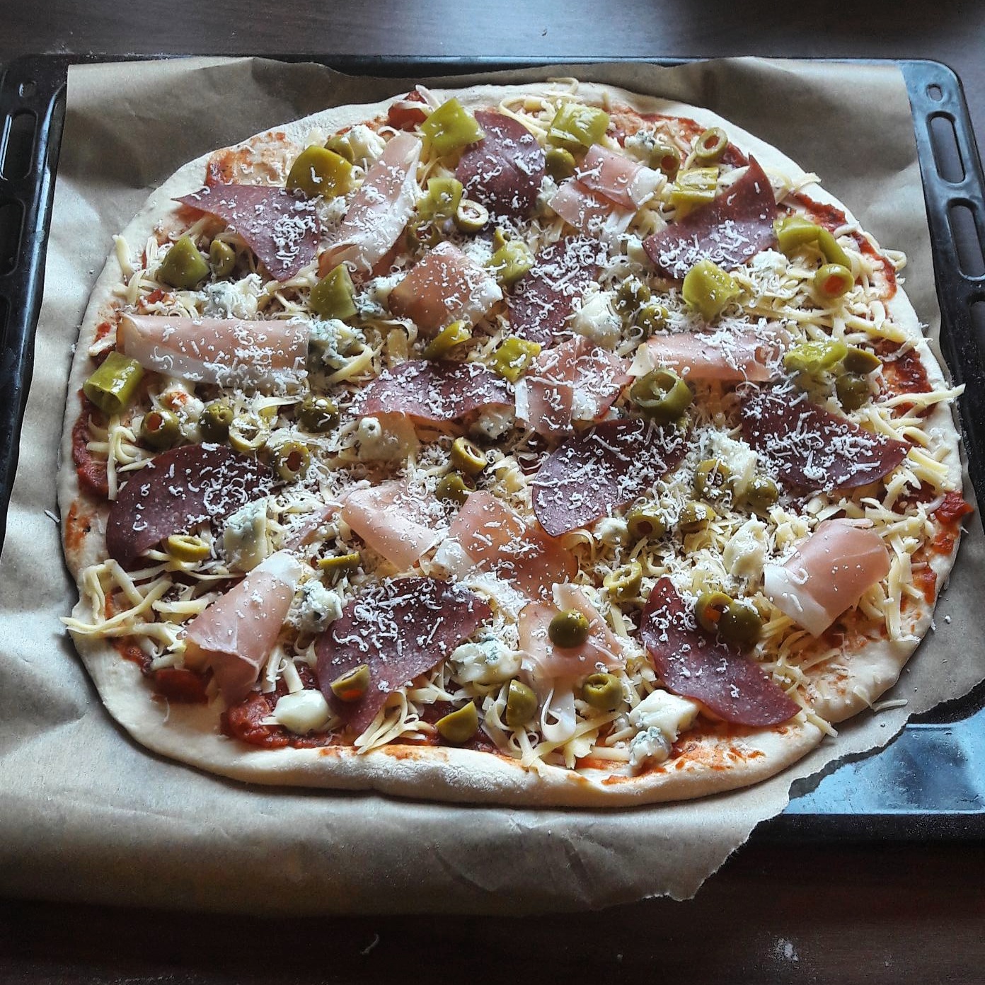 Kiedy ciasto wyrośnie, dzielę je na dwie części. Pierwszą partię umieszczam na stolnicy. Formuję krążek ugniatając go dość mocno palcami dłoni i stopniowo rozciągając aż do uzyskania pożądanej wielkości. Jeśli planujecie zrobić pizzę na cienkim cieście, proponuję podzielić całość ciasta na więcej porcji. Na koniec używam wałka delikatnie rozwałkowując ciasto na boki. Następnie przenoszę je na blachę wyłożoną papierem do pieczenia i smaruję sosem. Uważajcie z jego ilością. Zbyt dużo sosu spowoduje, że finalne ciasto będzie opadać. Na mój wielki placek daję 3 spore łyżki sosu, a na to ulubione dodatki.