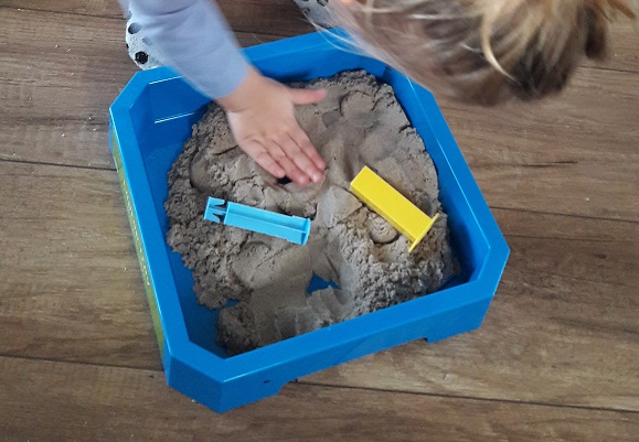 Bardzo trafionym dla L. prezentem okazał się piasek kinetyczny. Uwielbia go w przeciwieństwie do mnie. Z pewnością nie polecam jajecznicy z piaskiem, ale do zabawy nadaje się świetnie 😉